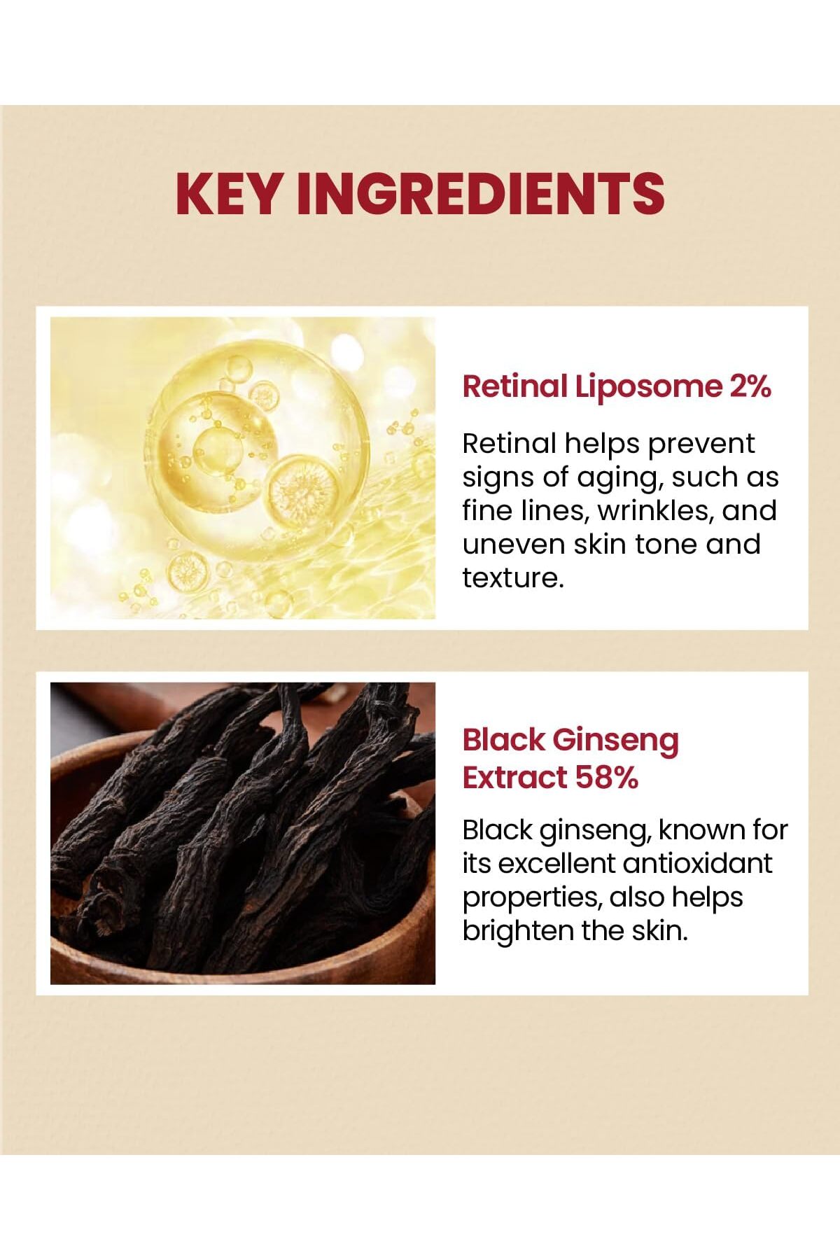 المكونات الفعالة: Retinal Liposome – Bakuchiol – Vitamin C – 3 Peptides – Tocopherol – مستخلص الجينسنغ الأسود
